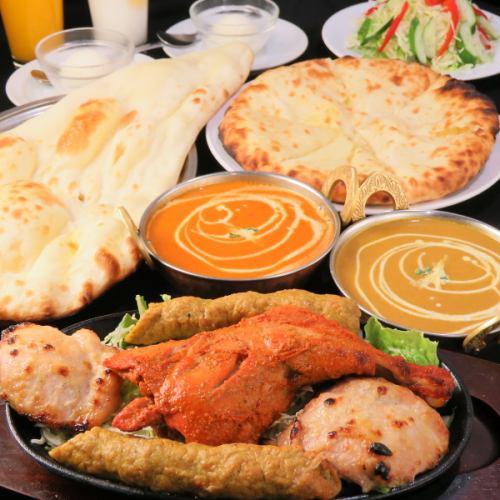 サラダ、タンドリーチキン、シークカバブ、チョイスカレー(2)、チョイスナン(又)ライス、生ビール、ソフトドリンク、デサート