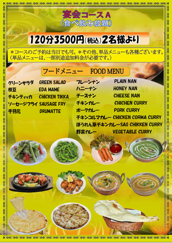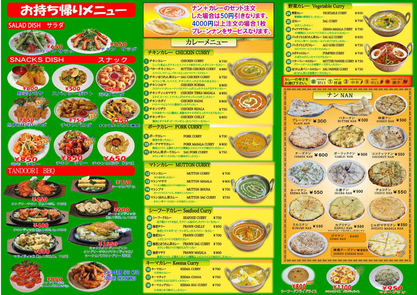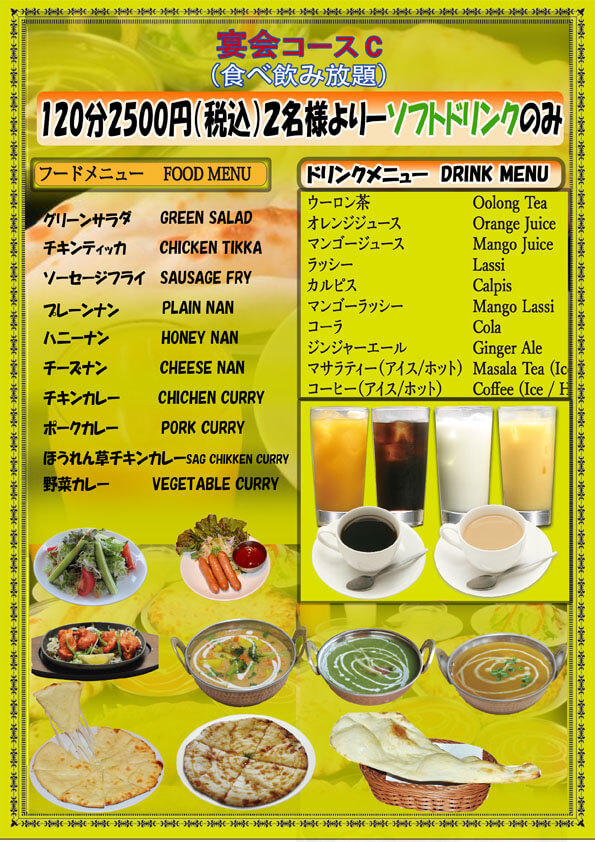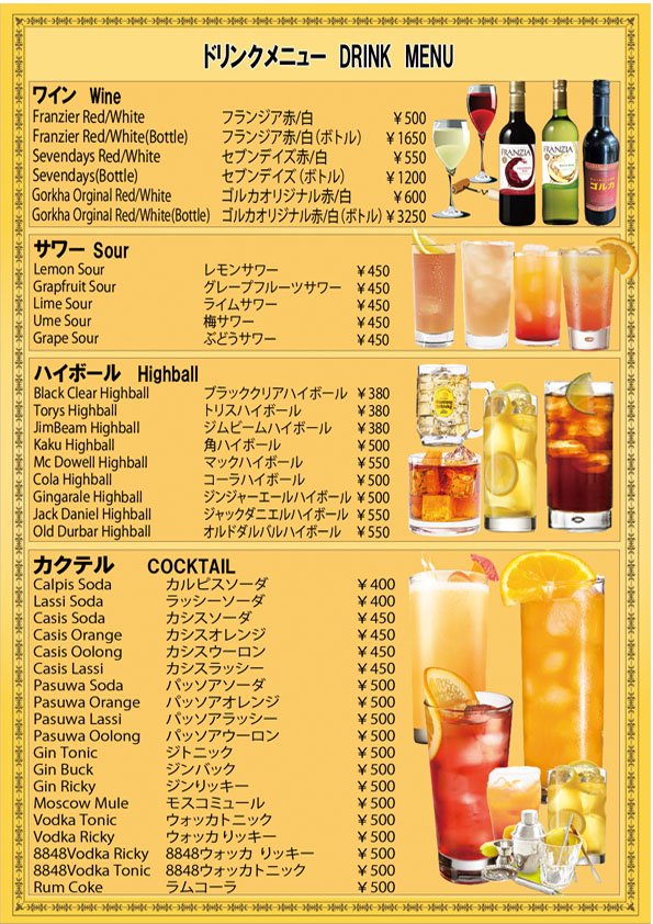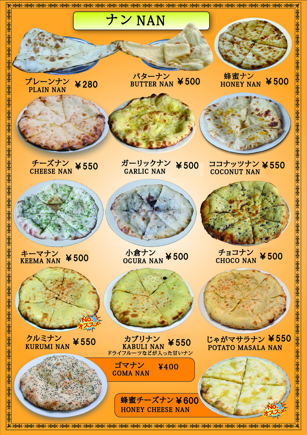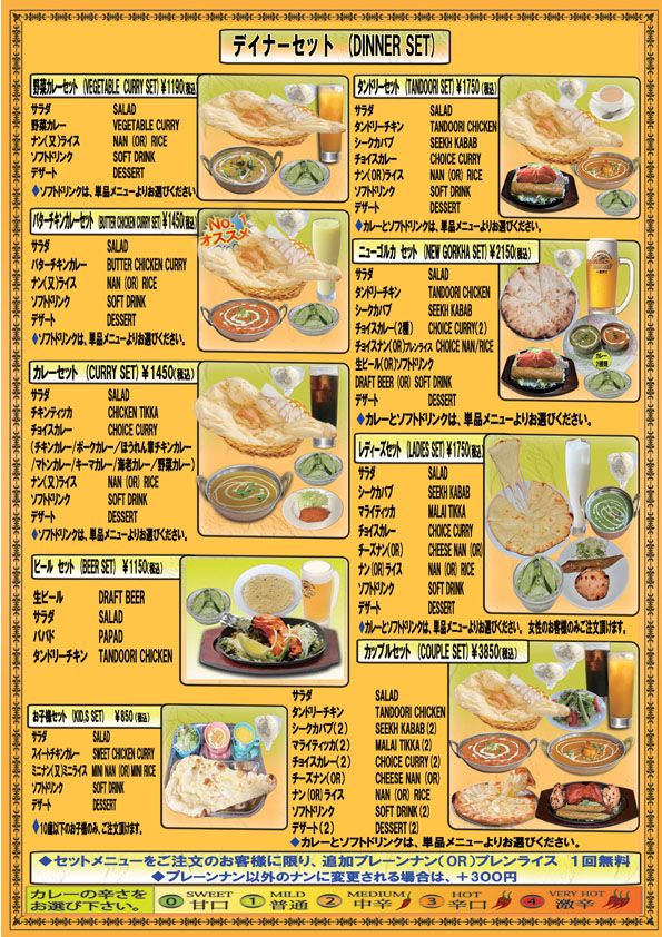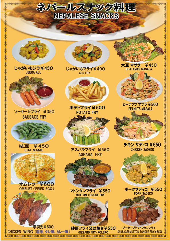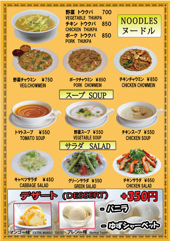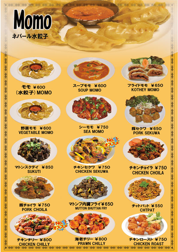 メニュー おいしいメニューNEW GORKHA RESTAURANTおいしさと健康を両立する食品をぜひお召し上がりください。 ランチ カップルセット (COUPLE SET) ディナー 宴会コース 人気のメインコースおすすめ チーズナンセット¥1150 サラダ、チーズナン、チョイスカレー、ソフトドリンク ニューゴルカセット¥2150 サラダ、タンドリーチキン、シークカバブ、チョイスカレー(2)、チョイスナン(又)ライス、生ビール、ソフトドリンク、デサート チャウミン¥850 野菜チャウミン、ポークチャウミン、チキンティッカチャウミン モモ¥600 モモ (水餃子)、スープモモ (水餃子)、フライドモモ ナン NAN ネパールスナック料理 (Neplese Cusine Snacks) お持ち帰りメニュー ドリンクメニュー